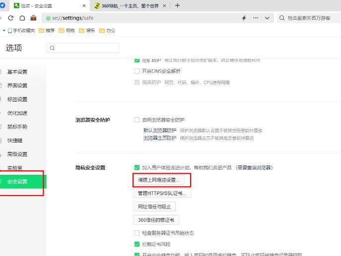 3、找到【安全设置】进行点击,然后知识兔滚动右侧页面直到找到【隐私安全设置】,将该选项后面的【清理上网痕迹设置】按钮进行点击打开。