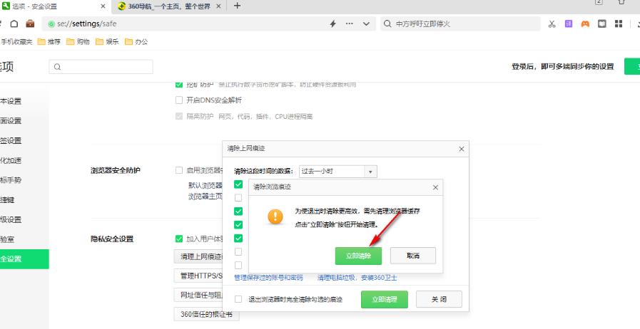 5、勾选之后会弹出一个窗口,将该窗口中的【立即清除】按钮进行点击即可,那么当你关闭浏览器的时候会自动的清理上网痕迹。