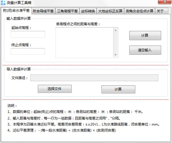 3、本程序为四等水准近似平差。高差闭合差限差:≤±20vVL,L为水准路线距离,闭合差单位:mm。
