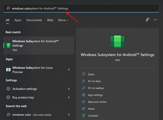 按Windows键并在搜索栏上输入适用于Android的Windows子系统。