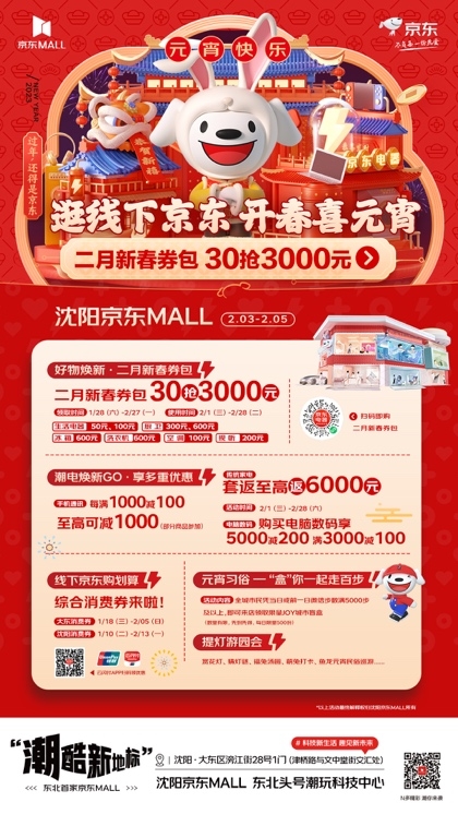开年就要焕新,沈阳京东MALL开年第一波福利超值来袭。店内潮电焕新享多重优惠,套购至高返6000元,助力消费者开年焕新家,还有30元升3000元二月新春券包等你来抢。