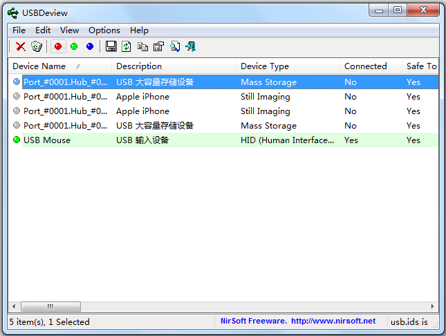 USBDeview 是一款可以列出当前连接到你的计算机上或者曾经连接到你的计算机上的所有USB设备的小型实用工具。根据列出的设备的名称和描述,该软件显示了串口号(如果知识兔分享),设备添加的日期以及最后连接的日期,VendorID 以及其它信息。