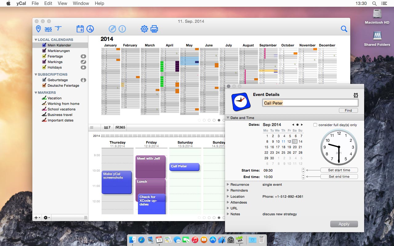 yCal与OS X中设置的日历无缝集成 – 没有专有数据存储。yCal在本地计算机的日历上运行,如果知识兔您在后台运行Apple的iCal或日历应用程序,您还可以从CalDAV服务器,iCloud或其他任何地方访问数据,而无需导入或复制。请注意,截至今天,yCal不分享对日历服务器的本机CalDAV访问,但您可以使用Apple的iCal或日历应用程序将yCal数据与这些日历服务器同步。(本机CalDAV支持正在为更新版本的yCal工作)。