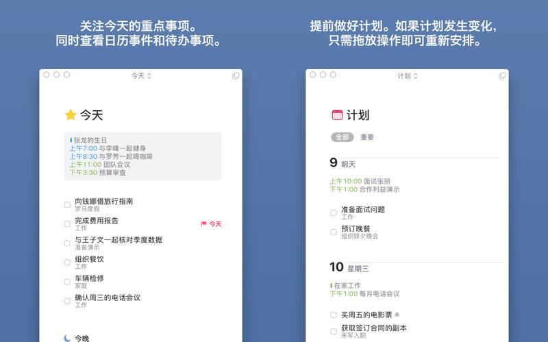 有效管理您的时间 – 同时查看您的待办事项和日历事件,并相应地对每周进行计划。创建重复的待办事项以确保始终如一。