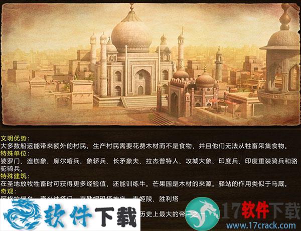 印度是堂堂四大文明古国之一,在历史上也是统治整个南亚次大陆和中亚沙漠的强大帝国,在《帝国时代2:被遗忘的帝国》中一度出现。帝国时代3中的印度已不复往昔的辉煌,成为英国的殖民地。游戏中的印度农民需要木材而不是食物,但是拥有伐木科技上有一系列加成和船运卡片,并且知识兔基本每张卡片都会送一个村民,使得印度前中期经济实力反而不俗。印度殖民时代即拥有即可出兵也可防守的阿格拉堡垒作为第一个奇观,殖民兵种异常全面,火枪散兵近战骑兵远程骑兵一应俱全而且知识兔性价比均很高,使得印度殖民大战非常强大,一跃成为帝国3里最强大的国家之一。堡垒时代印度又拥有昂贵但威力惊人的战象军团,知识兔以及从主城运送、近战反重步的软剑兵,同样是同类兵种中的佼佼者。值得一提的是从主城运送的软剑兵,属性相当于散兵但却近身作战,但是血多攻高攻速快有范围溅射,几乎吃定所有其他步兵,是强大的步兵兵种。印度的建筑风格在一开始不是很引人注意,但进入殖民时代后出现了圆顶和廊柱等等一系列的伊斯兰风格,直到升到工业时代後建筑的白瓦金鼎显得异常金碧辉煌。因为和中国、日本的文化相差甚远,使印度成为亚洲王朝中最与众不同的文明。