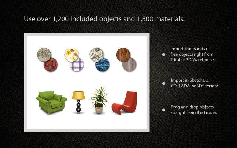 - Manually import objects in the SketchUp, COLLADA or 3DS format by simple dragging and dropping them from Finder.