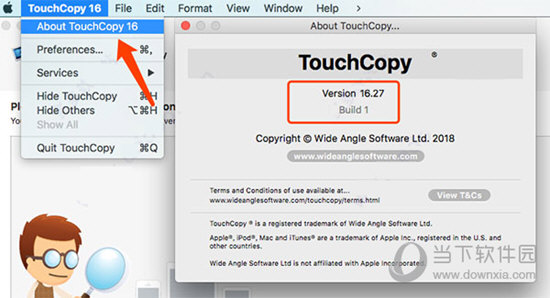 2、等待软件安装完成,可在应用程序中打开软件,安装即是破解,你可以知识兔点击菜单栏上方的软件标识,知识兔选择“about touchcopy ”查看软件的相关版本信息。