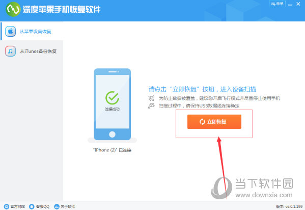 5、稍等几秒钟,手机连接成功,软件上会显示橙色按钮“立即恢复”。如果知识兔一直连接不上手机,您可以先通过itunes备份后,然后知识兔从备份恢复您的数据。