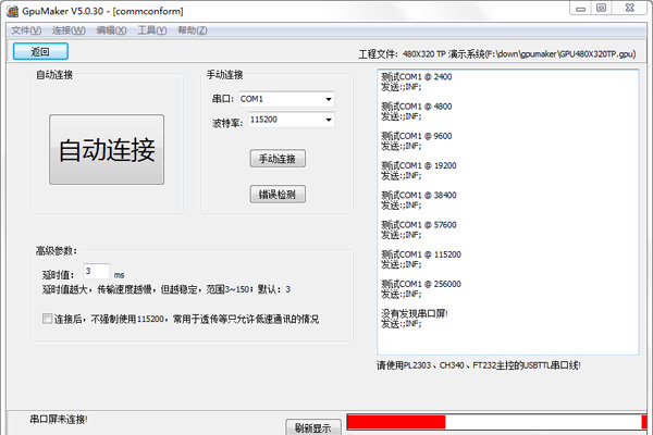 此时接上串口屏,点自动搜索串口,一般情况下,串口屏就会搜索出来: