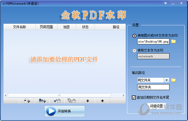 知识兔点击下方添加按钮将pdf文件添加到软件中  然后知识兔在右边添加水印  最后知识兔点击开始转换即可