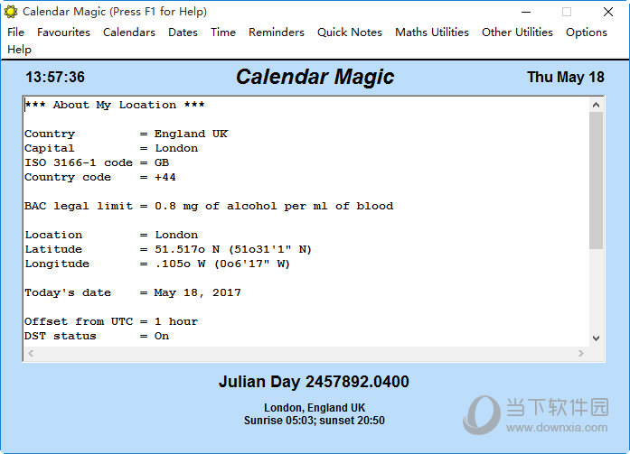 该软件还包括一个怀孕日期计算器,一个用于察看世界上各个不同地区当前时间的选项,一个全球距离计算器以及其它数学模型。你甚至可以生成一个分享你所感兴趣(日历)的关于你的生命和生理功能详细情况的报告。其它功能包括日历比照,两个日期之间的时间,假期观测,宗教日,太阳/月亮数据等等。Calendar Magic 支持多种语言和日历系统并且知识兔所有的结果都可以打印输出。