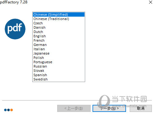 2、知识兔双击“pdfFactory Pro v7.26.exe”运行,安装原程序,如图所示,语言选择简体中文,知识兔点击下一步