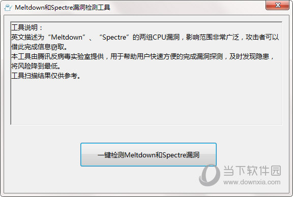 3.知识兔点击下方的“一键检测Meltdown和Spectre漏洞”按钮,然后知识兔耐心等待扫描完成。此工具将会检测电脑是否受到两个漏洞的影响。