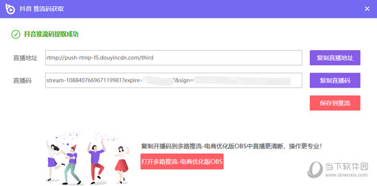 – 知识兔点击保存到推流,即可将获取到的推流码自动保存至OBS中,无需手动复制粘贴