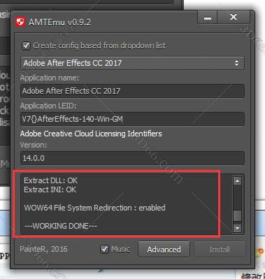 打开破解补丁之后设置成adobe after effects cc2017,知识兔点击install安装。